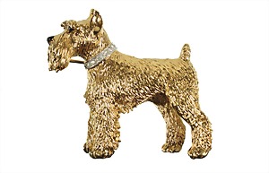 Brosche, TERRIER, goldfarben, signiert PANETTA (USA), plastisch ausgeformt, verziert mit klarem Strass u. schwarzem Emaille, ca. 52,5 x 46,0 mm
