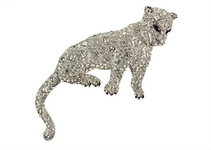 Sehr große Panther-Brosche, weißfarben, unsigniert, klare Strasssteine in unterschiedlichen Formen, schwarze Augen, Schwanz einklappbar, ca. 87,0 x 71,5 mm (Schwanz eingeklappt), auch als Anhänger zu Tragen !