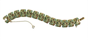 bracelet, gold colored, not signed, many colored rhinestone and opaque stones, oriental seem design, width = c. 19.0 mm, lenght = 20.0 cm, with safety chain !