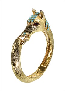 bangle horse head, not signed, gold colored, head decorated with small turquoise-colored stones and artificial pearls, red glass eyes, inside: c. 54.5 x 50.8 mm