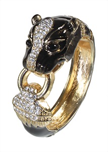 bangle gold colored, not signed, panther head is plastic completed, colorless rhinestone, black enamel- olor:, inside: c. 59.3 x 50.2 mm, spring mechanism !