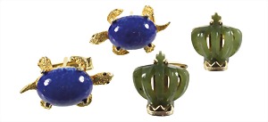 lot: 2 pairs of cufflinks, metal gold colored, turtle with blue marbled stone and red glass eyes, c. 31.0 x 18.2 mm, crown (sig. S) with jadeite/nephrite c. 18.0 x 20.5 mm