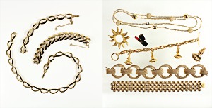 lot: 1 necklace and 2 bracelets with folding clasps, gold colored, signed: "MONET", black enamel coating, 1 necklace, lenght = 41.5 cm (plus 2.0 cm extra for remove), 1 bracelet with safety chain, width = 14.5 mm, lenght = 18.5 cm, 1 bracelet with safety chain, width = 20.0 mm, lenght = 18.0 cm, 1 bracelet, signed Grosse GERMANY 1968, knurled circles, lenght = 20.8 cm, 1 necklace, signed Grosse GERMANY 1973, grooved balls, lenght = c. 80.0 cm, 1 bracelet, Switzerland signed GB MM GENEVE, 20 micron gilded, lenght = 19.0 cm, 1 brooch, sun, signed HELENA RUBINSTEIN, diameter = c. 45.0 mm, 1 Stik-Pin lipstick, signed LANCOMB, colored enamel coating, height = 30.2 mm, 1 lips brooch (mouth and nose) signed Dali, 1 lips bracelet, signed SALVADOR DALI (mouth-nose), toggle clasp, lenght = 19.0 cm, interesting lot !