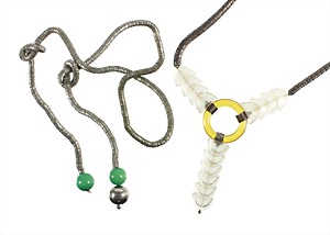 lot: 2 necklaces, silvery, ART-DECO 1930s, 1 necklace with green balls diameter = 17-17.5 mm (bakelite ?), lenght = c. 80.0 cm, 1 necklace with yellow glass ring and transparent glass bowls, lenght = c. 66.5 cm, twist-lock, front height = c. 11.0 cm