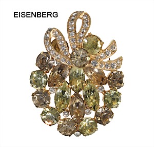 Brosche mit Schleife "EISENBERG", goldfarben, signiert EISENBERG ICE, zartgelb- u. braunfarbener Strass, Schleife mit farblosem Strassbesatz, ca. 42 x 57 mm