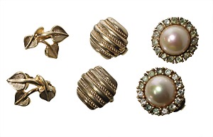 lot: 3 pair of ear clips by Christian Dior, metal yellow, signed: Chr.Dior GERMANY, 1 pair of clips with pearl and set with colorless stones, diameter = 18.5 mm, 1 pair of clips with 3 leaves, height = 18.3 mm, another pair, height = 18.3 mm