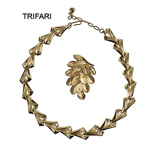 lot fashion jewelry: TRIFARI, yellow metal, signed TRIFARI, 1 brooch with stylized leaves, c. 53.6 x 35.4 mm, 1 necklace with chain extender, width = 15.2 mm, lenght = 39.0 - 42.5 cm
