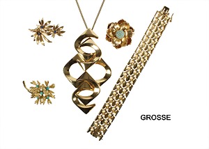 Lot Modeschmuck Fa. GROSSE Pforzheim, Metall gelbfarben, alle signiert: Grosse MADE IN GERMANY, 1 Armband 1961, L = 18,0 cm; 1 Brosche 1965 ca. 45,5 x 32,5 mm; 1 Brosche BLUME D = 37,7 mm, beide mit türkisfarbenen Steinen; 1 Brosche 1962 mit Lapiskugeln und ein dekorativer Anhänger für die Abendgarderobe von 1972, H = 106,8 mm, Kette L = 60,0 cm