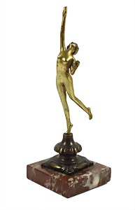 bronze figure, ART-DECO 1920/'30s, bronze gilded, not signed, gracile lady hover on a base, red-brown-white marble top, height = c. 23.3 cm, toweled !