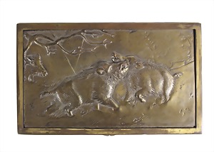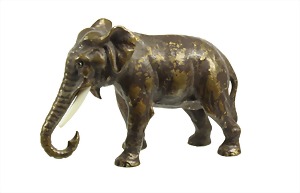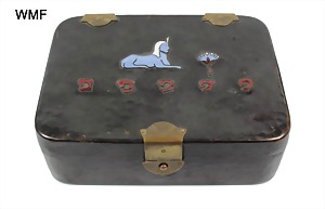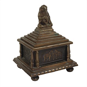 casket with cover, art nouveau around 1900, bronze, signed: ZAMETZER & BÉKA MÜNCHEN, on the cover sits the Indian deity Ganesh, at the sides textured elephants and birds, on the corners double-pillars, four pressed feet, c. 13.5 x 12.0 cm, height = c. 17.5 cm, heavy version!