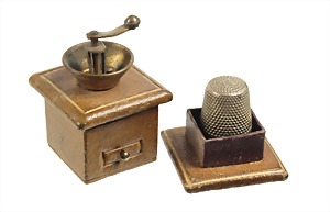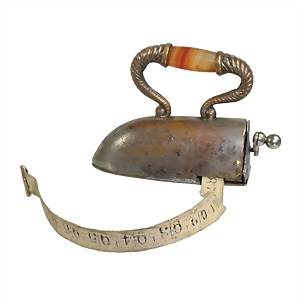 "MASSBAND", Miniatur Bügeleisen um 1900, in das Gehäuse ist ein Maßband eingearbeitet und lässt sich mittels einer Kurbel einrollen, Griff mit Carneol ausgearbeitet, L = 6,3 cm, H = 4,2 cm