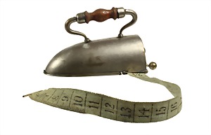 MASSBAND", Miniatur Bügeleisen um 1900, in das Gehäuse ist ein Maßband eingearbeitet und lässt sich mittels Kurbel einrollen, Griff mit Holz ausgearbeitet, von unten zu öffnen, L = 8,7 cm, H = 4,7 cm