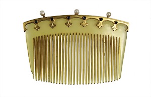 hand sawed comb, tortoise shell, 1880/1900, probably France, metal fire-gilded, ending with blue stones and jeweled with pearls , c. 52.8 x 37.8 mm, For this item a shipping to non-EU countries is not possible !