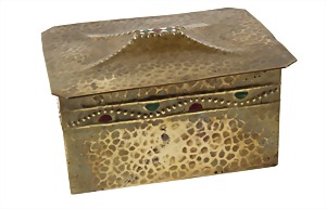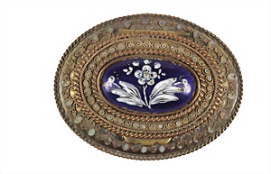 box, early 20th century, copper gilded, floral painted glass, rests of the enamel coating, very fine knurled soldered with wire, hinged lid, 60.0 x 47.0 x 17.6 mm