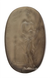 smoky quartz intaglio, early 20th century, presentation of a lady covered only with a scarf, standing under a tree, in the hands a book and a quill holding, in the background a pillar with a cup, Russian letters (on both sides at the edge), c. 54.7 x 32.2 x 6.8 mm, edge is slanting touched