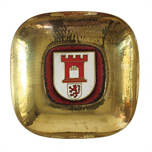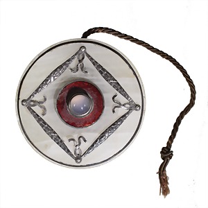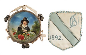 Lot: 1 Verbindungswappen mit Aufhänger, 1892 und den Initialen: TB ! 1 Mini-Tamburin, außen mit 6 Schellen/Glöckchen, beidseitig bemalt (Gouache), D = ca. 76,5 mm