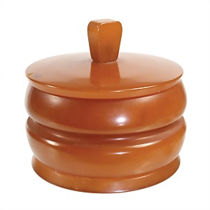 Bakelit Deckeldose, ART-DECO 1930/40er Jahre, honigfarbener Korpus mit eingezogenem Ring, D = 81,6 mm, H = 72,0 mm (unten am Deckel kleiner Chip)