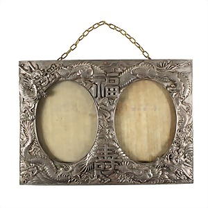 picture frame for two oval pictures, silver-plated metal , China 1920s, textured kite /dragon and Chinese character are decorating the frames, chain suspension, c. 21.5 x 16.3 cm