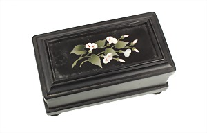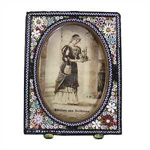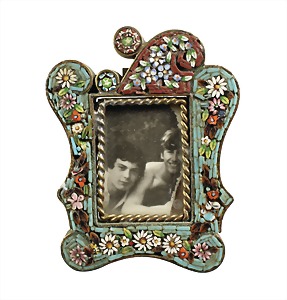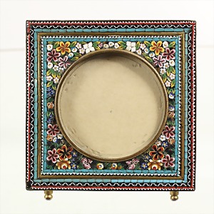small picture frame (asymmetrical), Italy around 1900, fine "MIKROMOSAIK" with flowers motifs and ornaments, with holding device at the back , c. 4.5 x 5.6 cm