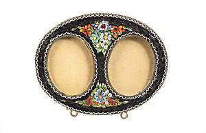 oval picture frame for two pictures, Italy around 1900, "MIKROMOSAIK", colorful flowers stehen in contrast for the black tesserae, checkered lines around the frames, metal edging, on the reverse a holding device (afterwards replaced), c. 10.3 x 8.3 cm