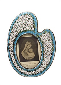 Großer Bilderrahmen MALER-PALLETTE, Italien Anfang 20.Jhd., "MIKROMOSAIK", ein Meer aus Kamillenblüten werden von zarten Blättern aufgelockert, blaue backsteinförmige Mosaiken umrahmen das Blütenmeer, Metalleinfassung. Rückseitiger Aufsteller (später ersetzt), ca. 21,5 x 16,0 cm