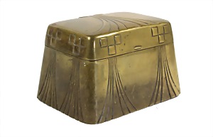 Deckel-Schatulle, Jugendstil um 1900, Bronce, signiert: ZAMETZER & BÉKA MÜNCHEN; auf einem getreppten Deckel sitzt die Indische Gottheit GANESHA, die Seiten zieren reliefierte Elefanten und Vögel, auf den Ecken Doppel-Säulen, vier gedrückte Füße, ca. 13,5 x 12,0 cm, H = ca. 17,5 cm, schwere Ausführung!