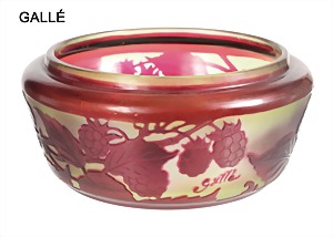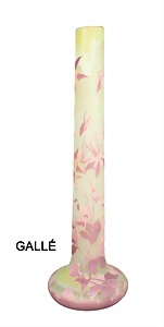 big early vase by "GALLÉ" around 1890/1900, cameo-technology, clear glass, three fold overlay in green, light and dark rose color shades, granny's bonnets and leaves over the whole glass body , height = 58.5 cm, foot diameter = c. 19.5 cm, unusual size, Japanese like signed: Gallé, nice undamaged original condition !