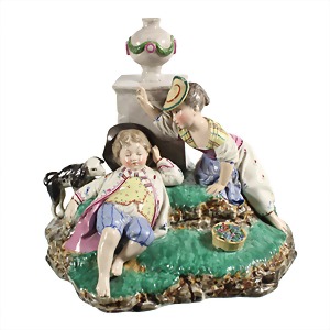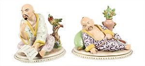 lot figures: porcelain factory Sitzendorf (Made in Germany), 1 cross-leggedChinese with document, beside it on a stump with flowers and grooming cockatoo, height = 12.0 cm, diameter = 11.5 cm, 1 Chineses lying on a cushion, in the background a vase with flowers, height = 10.0 cm, diameter = 13.5 cm, both: white porcelain, polychrome painted, oval base with edge of gold and plastic golden beaded rim