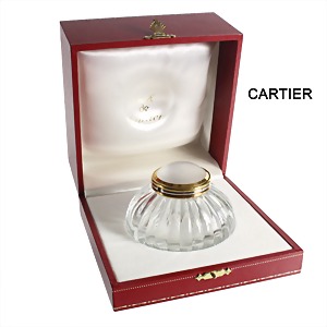 ink vessel from the must de Cartier Trinity series around 1990, signed must de Cartier N° 001498, lead crystal body, diameter = c. 82.5 mm, height = c. 62.5 mm, total 385 g, original box ! from a liquidation !