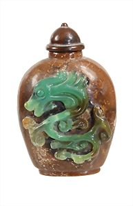 SNUFF BOTTLE (sehr ausgefallen), China 1. Hälfte 20.Jhd., gravierter/geschnittener Drache, Chrysopras auf Muttergestein (teilweise hinterschnitten), kleiner Silberlöffel im Deckel eingearbeitet, H = 58,2 mm