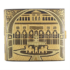 Zigarettenetui, TOLEDO Mitte 20.Jhd., Metall: schwarz veredelt, teilvergoldet, Blick durch einen Torbogen auf das Innere eines Palastes, Etui gebogen (für die Hosentasche), ca. 90,0 x 76,8 x 14,5 mm