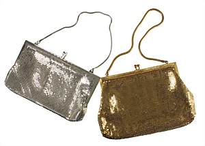 2 Abendtaschen aus den 1950er Jahren, silberfarbene Tasche ca. 18,0 x 12,5 cm; goldfarbene Tasche ca. 20,0 x 15,0 cm, innen mit Spiegel zum rausnehmen (nur Tasche gemessen), Paillettengeflecht beweglich gearbeitet, wenig benutzt !