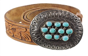 Gürtelschließe der NAVAJO Indianer, Silber, signiert: R.PETER NAVAJO, Schnalle mit 10 Türkisen besetzt, ca. 75,6 x 57,5 mm, Ledergürtel aufwändig geprägt, L = 112 cm