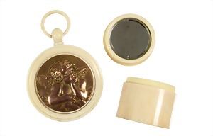 lot ivory: small box and portrait around 1900, box with faceted mirror, screwable cover, diameter = 41.5 mm, height = 36.5 mm, portrait of a angle (embossed copper, signed), height = 90.0 mm, For this item a shipping to non-EU countries is not possible !