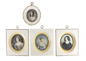 4 ivory pictures 20th century, miniature painting on ivory, woman portraits of famous wives, e.g. 1 picture: Joséphine de Beauharnais (wife of Napoleons), 1 picture: Helene Kreszenz Sedlmayr, married Miller, was considered as paragon of the beautiful Munich woman, 1 picture: Lola Montez, the mistress of Ludwig I, all pictures c. 12.3 x 14.3 cm, 1 oval picture c. 9.3 x 10.5 mm, pictures with textured frames and partially with mother of pearl insert , no shipping outside EU !!