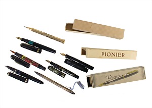 lot writing utensils: 1 REFORM glass nib piston fountain pens, various piston fountain pen: 1 LAMY, 1 x OSMIA, nib yellow gold 585/000, 1 x TROPEN (with original casket), 1 x KAWEKO Sport, 1 four-color colored pen/crayon DEURAG-NERAG, gold colored, ! ballpoint, silver (engraving: SEL), 1 casket: PIONER