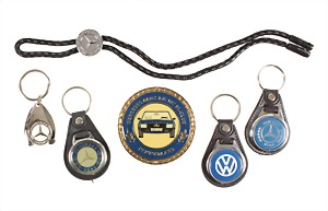 Lot: 4 Schlüsselanhänger, 3 x Mercedes-Benz, 1 x VW; 1 Plakette; MERCEDES-BENZ R/C 107 SL. CLUB DEUTSCHLAND, farbiger Emaille Lack, D = 70,0 mm (mit Halteschrauben) in sehr gutem Zustand, plus eine Zugabe !