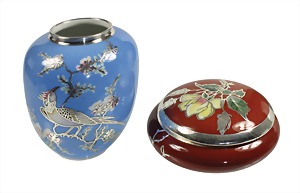 Lot: kl. Vase u. Deckeldose, "ART-DECO" 1930/40er Jahre, Silber OVERLAY, Vase, sig. KPM Krister GERMANY, Porzellan blau, im asiatischem Stil, Zweig mit Vogel, Blumen u. Blattmotiven bemalt, H = 10,5 cm, D = ca. 8,3 cm; Deckeldose, sig. Veyhl GERMANY, farbige Blüte mit Blättern, H = 4,6 cm, D = 9,9 cm, schöner Erhaltungszustand !