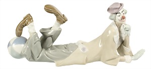 big lying clown with ball, manufactured: LLADRO (Spain), porcelain polychrome painted, lenght = 38.0 cm, height = 16.0 cm