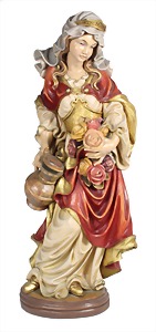 wooden figure on a base, Oberammergau 1990, ELISABETH with roses, colored set and painted, partially gold equiped, height = 59.5 cm, probably limetree wood