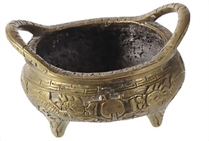 Chinese brass vessel, probably first half 20th century, down below at bottom with cast brand, inside another motif, outside complete decorated with dragon motifs and symbols , slightly stick out handles, diameter = c. 10.8 cm