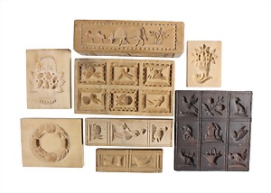 lot: different molds, South German around 1900, 1 butter mold(4-sided carved), cuboid c. 4.7 x 5.0 x 16.2 cm, 6 Springerle-mold made of wood, 1 Springerle-mold made of iron c. 12.3 x 12.3 x 1.0 cm (rare !!)