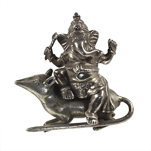 Indian deity Ganesh (Ganesh is the God of wisdom, sciences and arts, and lord of the obstacles) sitting on a rat, mid of the 20th century, silver (checked), faithful companion of the deity is the mouse or a rat, the surface is partially textured and smooth, figure is plastic worked, width = c. 90.0 mm, height = 92.1 mm, total 368.2 g