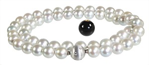 Perlenkette mit 2 Wechselschließen, sehr feine Akoja-Perlenkette ca. 8,0 - 8,5 mm, ebenmäßige Oberfläche mit exquisitem Lüster; 1 Kugel mit Patentschließe WG 750/000, 12 Brillanten ca. 0,17 ct tw-vsi, L = 49,5 cm; als Ergänzung 1 Onyx-Patentschließe D = 12,0 mm