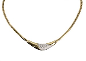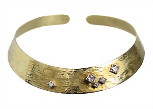 Halsreif GG 585/000, signiert K.K.-B (Goldschmiede Kienast Worms), 5 Altschliff- Diamanten ca. 2,2 ct w-si/p (weiß gefasst), die beiden größten Steine mit Tragespuren an der Rondiste (Diamanten aus altem Schmuck neu eingefasst !), vorne H = 22,2 mm L = ca. 39,0 cm (direkt am Hals anliegend !! total 85,5 g