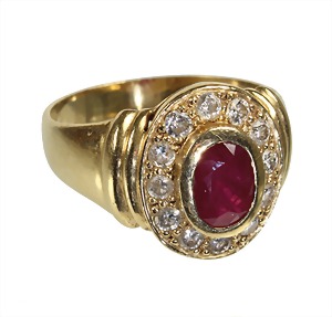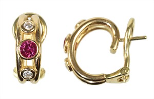 1 Paar Rubincreolen mit Brillanten (mit Stift), GG 750/000, 2 Rubine ca. 0,50 ct, 4 Brillanten ca. 0,12 ct tw-vsi, H = 15,0 mm