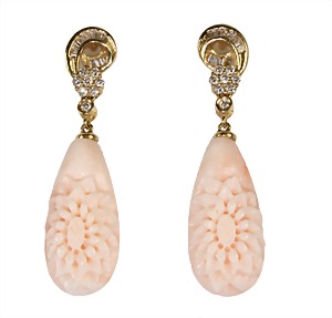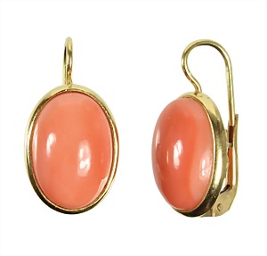 ear pendants (with hinged clasp), Italy, yellow gold 750/000, corals cabochons (c. 14.0 x 10.0 mm), height = 22.0 mm, total 5.1 g, For this item a shipping to non-EU countries is not possible !