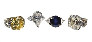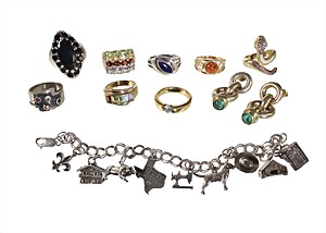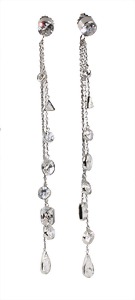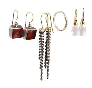 lot: 3 pair of ear pendants and 1 ring, silver, yellow gold 750/000 (checked), one pair with faceted drops (gentle rose), height = 26.5 mm, one  pair with Murano glass, one  pair with white stone wreath and hanging ball chains, height = 68.5 mm, 1 ring, ring width c. 54