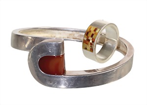 lot: bracelet and ring, vintage, silver 925/000, 1 ring, amber intarsia, width = 7.7 mm, ring width c. 56,5, 1 bracelet (signed), with red brown cornelian, width = 22.5 mm, inside c. 56.5 x 45.5 mm