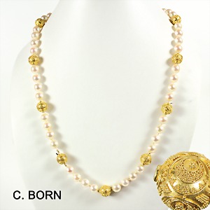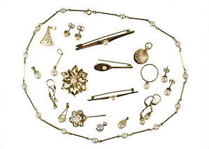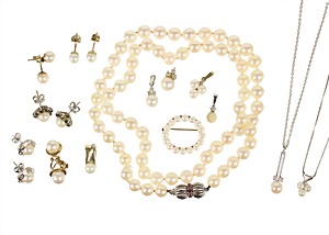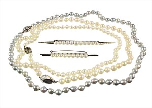 Lot: 2 Akoja-Perlenketten und 2 Nadeln, WG 585/000: 1 Kette (grau), D = 7,3-8,0 mm, L = 60,0 cm; 1 Kette, D = 7,5-8,0 mm, L = 51,0 cm; 2 Nadeln, L = 82,0 u. 113,6 mm; 1 Kette, WG 333/000, D = 6,0-6,5 mm, L = 40,5 mm, Ketten mit schönem Lüster !! Diverse Ersatzperlen !
